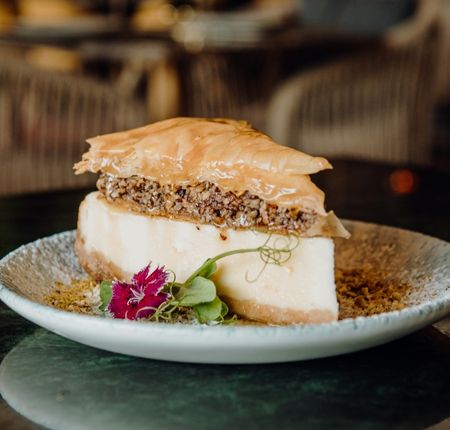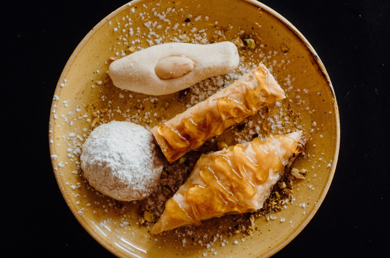 pasta filo rellena de higo con jocoque sobre crema de pistache
