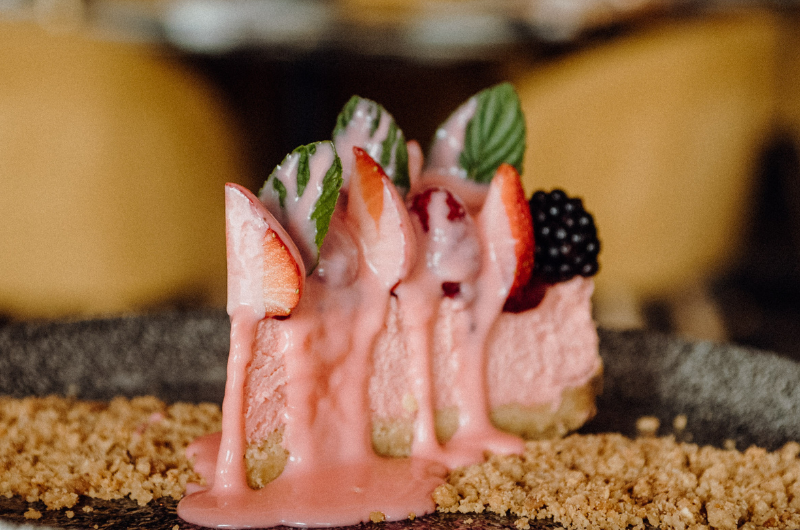 New York Cheesecake con frutos rojos y crumble de almendra, bañado con salsa de chocolate